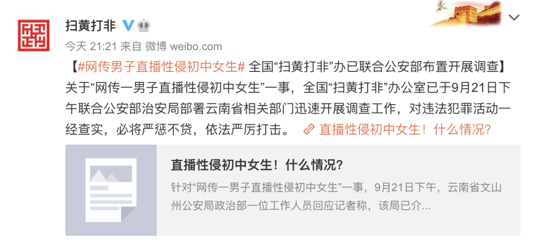 9月21日,全国“扫黄打非”办公室官方微博表示,针对“网传一男子直播性侵初中女生”一事,全国“扫黄打非”办公室已于同日联合公安部治安局部署云南省相关部门迅速开展调查工作,对违法犯罪活动一经查实,必将严惩不贷,依法严厉打击。
