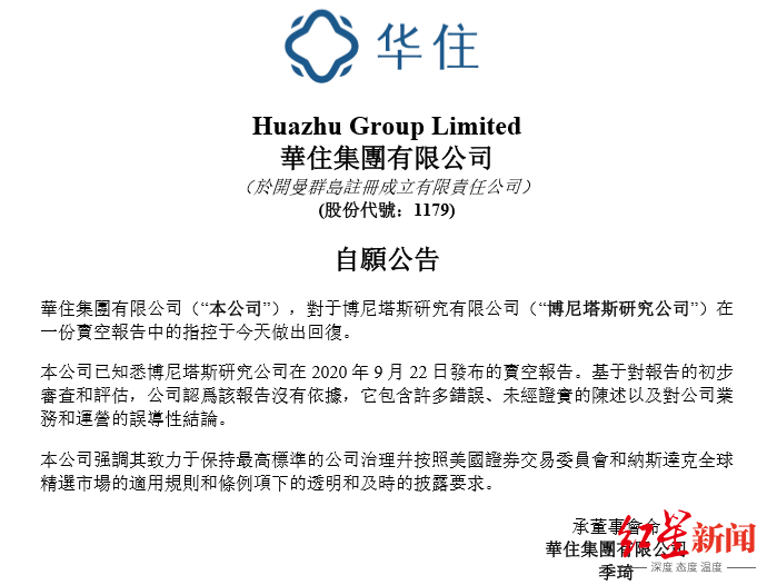 针对博力达思的指控,9月22日早间,华住集团紧急回应,称公司已知悉该沽空报告。基于对报告的初步审查和评估,公司认为该报告没有依据,它包含许多错误、未经证实的陈述以及对公司业务和运营的误导性结论。