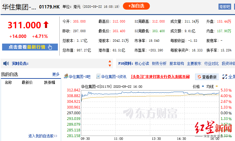 华住开盘报305港元,较发行价上涨2.69%。9月22日收报311港元,涨4.71%,总市值987.27亿港元。