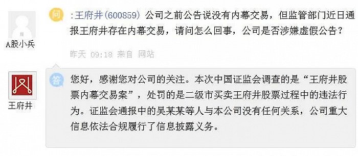 “证监会通报中的吴某某等人与公司没有任何关系。”9月22日开盘前,在上交所互动交流平台上,王府井方面再度“撇清关系”,并称中国证监会调查的是“王府井股票内幕交易案”,处罚的是二级市买卖王府井股票过程中的违法行为,公司重大信息依法合规履行了信息披露义务。