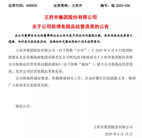 就在证监会发布通报后不到一个小时,王府井快速作出回应“撇清嫌疑”。王府井董秘办人士称,王府井在申请免税品经营资质大半年后,才获得财政部的通知同意,事发也很突然。在财政部的通知下达前,公司对于获得资质的信息并不知情。