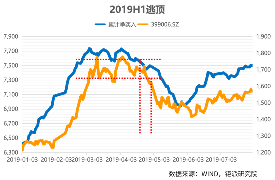 2019年3-4月形成了一个平台,之后市场下杀。创业板指在2019年4月29日破位,而早在4月23日北向资金累计净买入数值已破位。投资者可以找寻先行指标来指导投资。