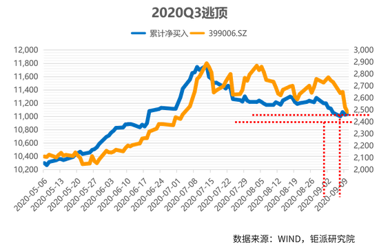 2020年9月9月创业板指破位,但是北向资金已早在9月3日创出本轮盘指的新低。创业板指数从7月即进入箱体震荡整理,事先要完美判断方向很难也不现实。北向资金净买入余额提前出现新低,必须谨慎。至此,北向资金已经2次提前于创业板指破位,具有一定的参考价值。