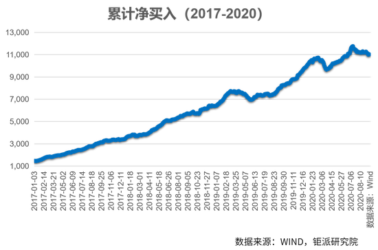 从2017-2020年北向资金累计净买入统计图表可知,外资不断买入,占A股比重不断提升。即使看似一根线往上走,微观层面依然有很多内容值得学习。