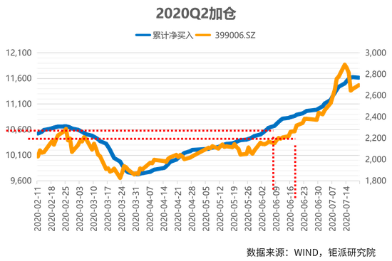 2020年在新冠疫情的影响下,全球都在进行“大放水”、“强刺激”的财政政策和货币政策的结合,使得3月市场在快速下跌后出现上涨迅猛的行情。在这过程中,创业板在6月19日创新高,而北向资金在6月8日先行创下了新高。这说明,北向资金在顶部盘顶的时候预知了风险先行撤离,同时在上攻的阶段看到了市场往上的趋势并果断地加仓。