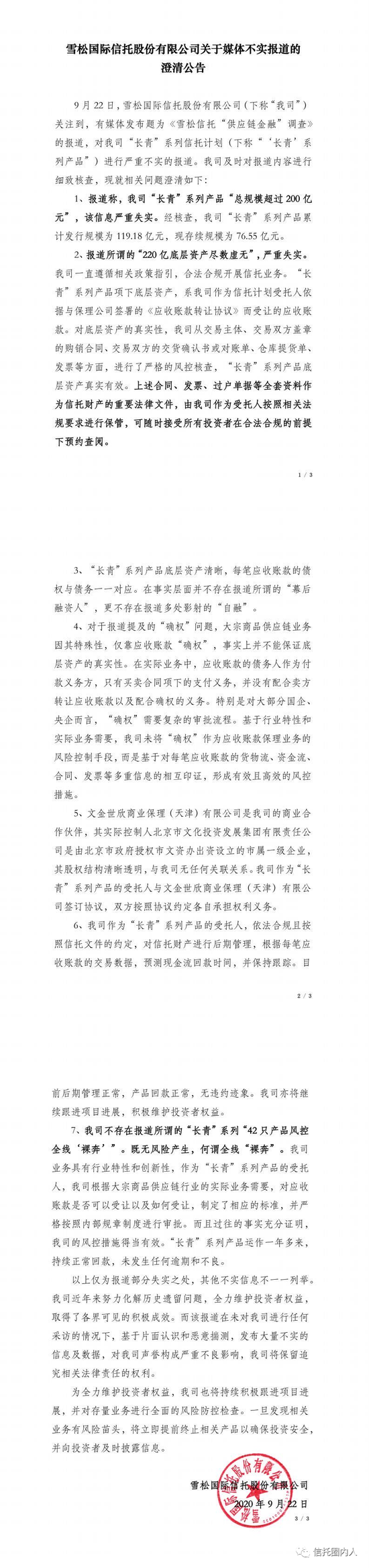 另外,雪松信托对近期的舆论也作了澄清,下面有公告全文。
