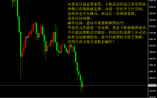从黄金目前走势来看,下跌意识形态已非常明显,价格已有效跌破支撑,并进一步打开下行空间,这明显是空头格局,所以后一步继续看跌,没有任何问题。