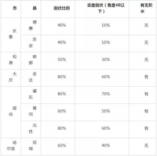 机构二:倒伏比例在40%-60%,倒伏的幅度也分轻重,倒伏离地面角度大于40度可视为情节较轻,不会影响玉米产量,小于40度则情节较重,这些玉米的产量可能受损20%。有积水地块则对产量更大,对于泡在水里的玉米那基本上就要面临绝收,或者有条件的,提前运回转做青贮饲料,而积水较少地块则要看后期的天气,若持续一周阴雨天气,也要面临绝收,若天气一直晴好,则会挽回一些损失,但质量和霉肯定不好。