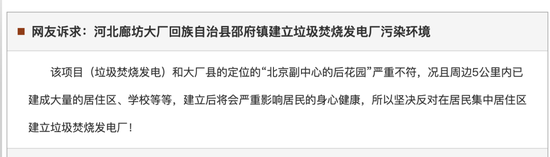 有人在河北省阳光理政平台中留言:“周边5公里内已建成大量的居住区、学校等等,建立(垃圾焚烧)后将会严重影响居民的身心健康,所以坚决反对在居民集中居住区建立垃圾焚烧发电厂!”