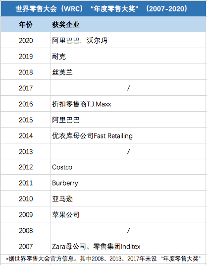 世界零售大会将该机构2020年零售业最高奖“年度零售大奖”授予阿里巴巴