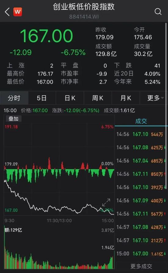 盘面上,行业板块全线下跌,航天航空、材料行业、旅游酒店、氦气概念、刀片电池等板块领跌。创业板低价股指数一度暴跌近7%。