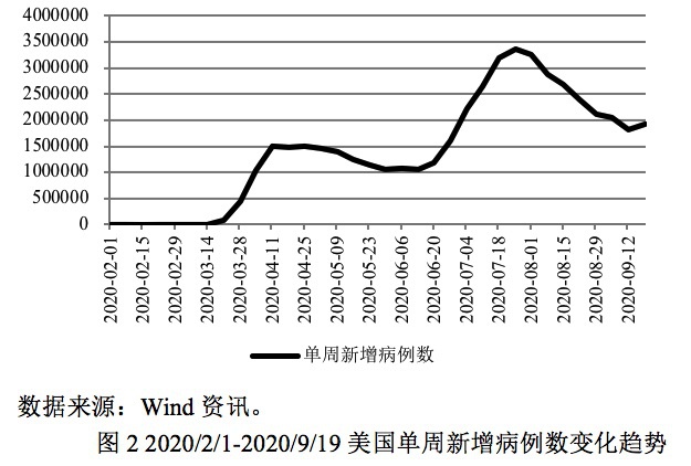 图2是美国疫情爆发至今单周病例数变化情况,由图中可以看出,在过去的一周中,美国新增病例数在连续八周回落后再度反弹。目前欧洲基本上处于疫情二次爆发状态。考虑到美国仍未实施有效的疫情防控措施,预计追随欧洲出现疫情二次爆发只是时间问题。尤其是利于疫情传播的秋冬季已经来临,更加提高了疫情二次爆发的可能性。美国华盛顿大学预计到了冬季美国疫情将更加严重。9月22日鲍威尔在美国众议院金融服务委员会作证时就曾表示,只有在所有人都非常有信心重新参与各项活动时,全面的经济复苏才会出现。然而现在显然不是这种情况。