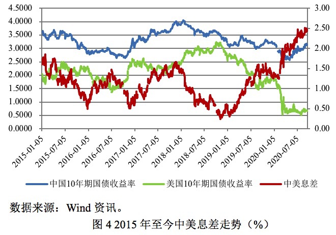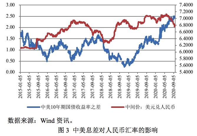疫情爆发后,虽然中美同步启动了宽松的货币政策,但美联储的宽松力度远大于中国央行,导致中美息差持续扩大。2020年2月11日,中美10年期国债收益率息差为130bp,而到了2020年9月21日,中美息差高达245bp。事实上,如果说从更长一点的周期来看,中美息差扩大始于2019年1月18日,当时中美10年期国债收益率息差为29bp。虽然自此之后中美息差持续扩大,至2019年10月31日升至155bp,然而在此期间人民币持续贬值,主要是因为中美贸易摩擦持续发酵,主导了这段时间内人民币汇率走势。而疫情爆发后,中美一阶段协议仍在执行,美方也并没有对协议的执行提出异议,中美息差持续扩大对人民币汇率持续走强产生了很大的助推作用。