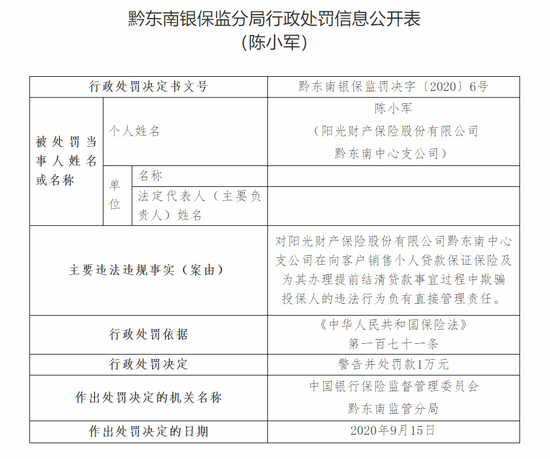 9月24日消息,黔东南银保监分局公布的行政处罚信息公开表显示,阳光财产保险股份有限公司黔东南中心支公司因在销售个人贷款保证保险及为投保人办理提前结清贷款相关事宜过程中,存在欺骗投保人的违法行为,被处罚款20万元。