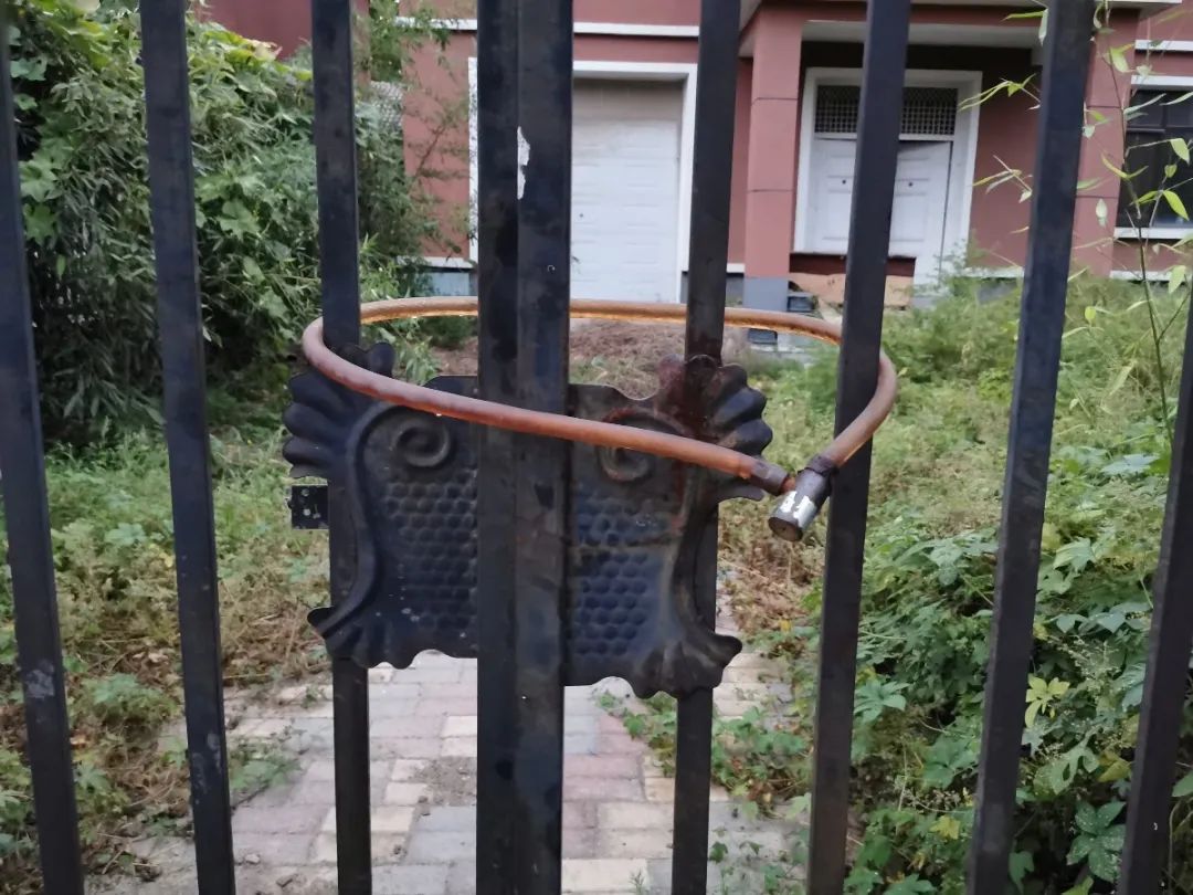 有村民反映位于大院东南角的两栋别墅有人居住。记者前往探访,发现这两套独栋别墅均装着朱红色大门,阔大的门板上钉着一排排金色铜钉,装着雕有兽头图案的铁门环。