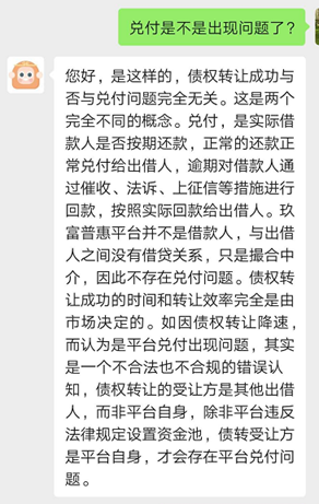 针对出借人询问兑付是不是出现了问题,玖富客服方面回应称,“玖富普惠平台并不是借款人,与出借人之间没有借贷关系,只是撮合中介,因此不存在兑付问题。债权转让成功的时间和转让效率完全是由市场决定的。如因债权转让降速,而认为是平台兑付出现问题,其实是一个不合法也不合规的错误认知。”
