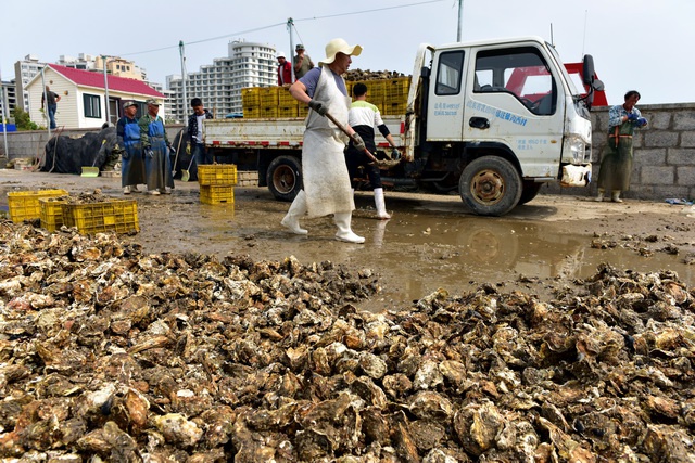9月24日,烟台长岛一码头上,渔民们正在装卸海鲜。摄影/章轲