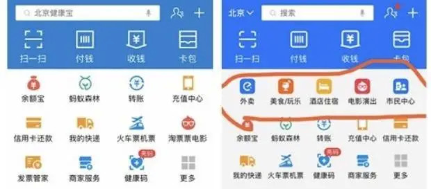 今年3月,支付宝进行史上最大改版,将“外卖”、“美食”、“住宿”、“电影演出”和“市民中心”五大模块加入到首页应用栏,且不能删除和移动。这些美团最主要的功能,突然出现在支付宝这样一个支付工具里,一度让很多人表示不适应。阿里的说法是,要将支付宝升级为数字生活开放平台。