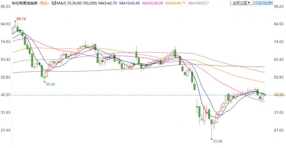 布伦特原油最低触及40.96美元/桶,收报42.26美元/桶,周线跌幅1.81%。
