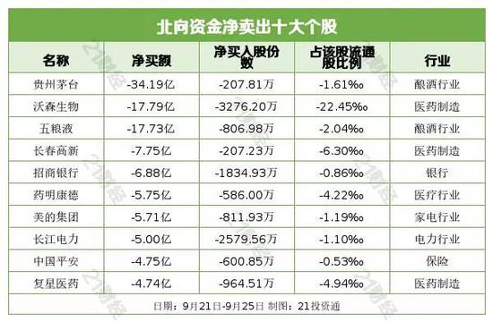 而当周医药制造行业则是北向资金出逃最多的行业,净卖出金额达53.81亿元,其中沃森生物(300142.SZ)被卖出17.79亿元,长春高新(000661.SZ)被卖出7.75亿元。