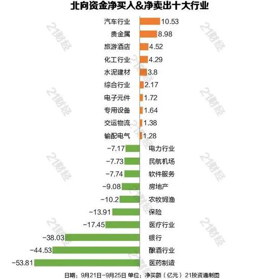 从净卖出金额来看,北向资金减持了47个行业,其中医药制造最多,净卖出金额达53.81亿元,其次是酿酒行行业,净卖出44.53亿元。银行、医疗行业、保险、房地产从净买入变成净卖出,金额分别为38.03亿元、17.45亿元、13.91亿元、9.08亿元。