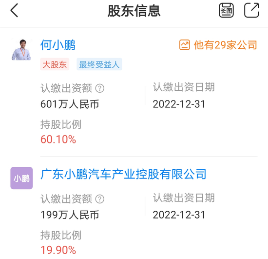 在股东信息方面,天眼查APP显示该公司是由何小鹏与小鹏汽车共同投资创立,其中何小鹏为第一大股东,持股比例为60.1%。