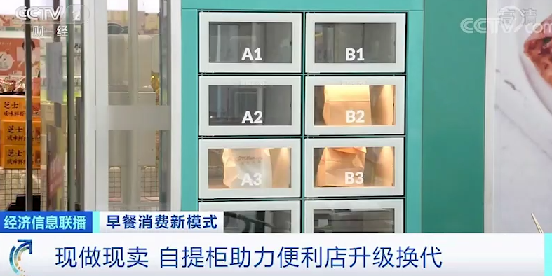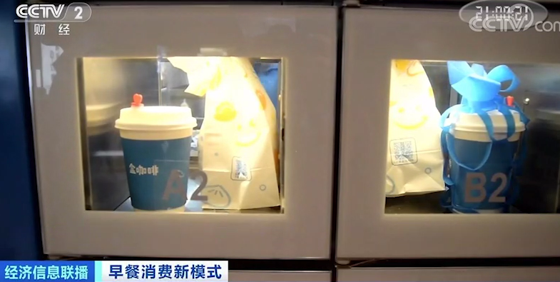 随后央视财经的记者在自提柜进行扫码,很快拿到了自己预订好的餐品。在走访中记者观察到,这种类型的早餐店主要为上班族设计,门店选址大多在上班族的必经路线上,从煎饼果子、肉包菜包,到咖啡和豆浆,基本上十元钱以内就能买到一份丰盛的早餐。
