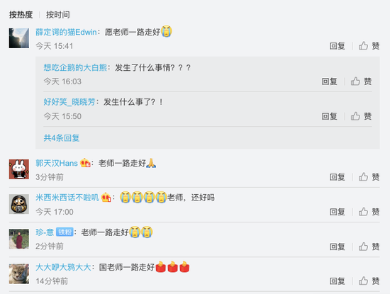 该篇微博下,获知噩耗的网友纷纷留言,“国老师一路走好。”