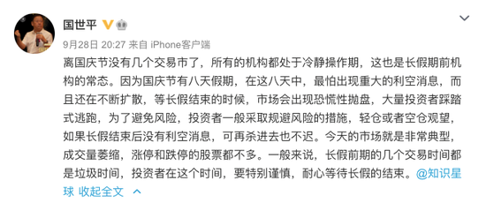 国世平在微博上表示,离国庆节没有几个交易市了,所有的机构都处于冷静操作期,这也是长假期前机构的常态。文末他还不忘向网友提示风险,“长假前期的几个交易时间都是垃圾时间,投资者在这个时间,要特别谨慎,耐心等待长假的结束。”