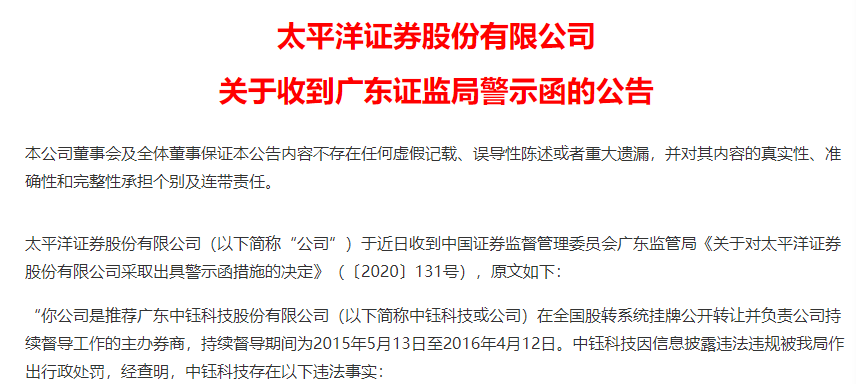 9月29日,广东证监局对太平洋证券出具警示函措施,原因则是其五年前督导的一家公司广东中钰科技股份有限公司(以下简称中钰科技)出现信息披露违法违规现象。而就在一天前,万联证券也因此事被监管开罚单。