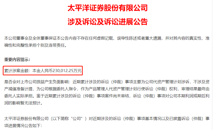 不仅如此,太平洋证券多起官司缠身。9月25日晚间,太平洋证券发布涉及诉讼及诉讼进展公告,公告显示,太平洋证券及其子公司在最近12个月内累计涉及诉讼(仲裁)金额达23亿元(本金)。