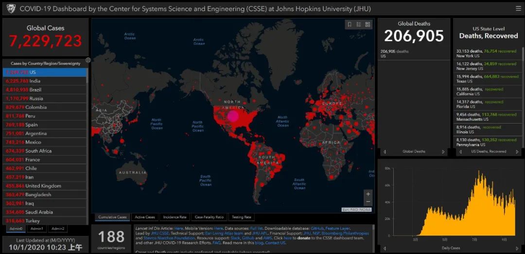 据约翰斯·霍普金斯大学最新统计数据显示,截至北京时间10月1日10时23分,美国累计新冠确诊病例已超722万,达到7229723例,死亡病例超20.6万,达到206905例。