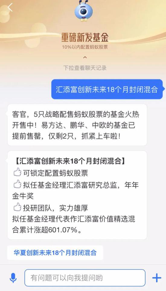 目前,在售的两只基金,蚂蚁财富主推了汇添富创新未来18个月封闭混合,还提示在假期期间正常认购。
