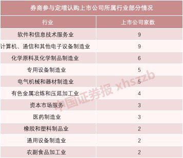 在上述券商参与的150多次上市公司定增中,涉及的上市公司数量为71家,从行业来看,计算机和软件行业的上市公司最受券商青睐。其中,计算机、通信和其他电子设备制造行业的公司数量最多,为9家;软件和信息技术服务业的公司数量同样为9家;化学原料及化学制品制造业的上市公司数量为6家。