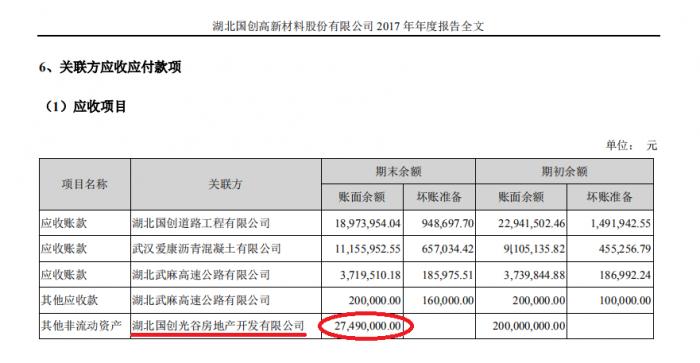 国创高新在2017年年报中列在“关联方应收应付款项”的“应收项目”中的涉及国创光谷地产2亿元的“其他非流动资产”,其期末余额从2亿元变成了2749万元。