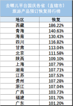 10月8日消息,去哪儿平台数据显示,今年全国15省(直辖市)的国庆旅游产品预订量超过去年。湖北地区各项旅游产品预订恢复至去年同期的7成以上,新疆地区恢复达到近8成,山东青岛恢复至8成,云南多城市预订量超去年同期3成以上。