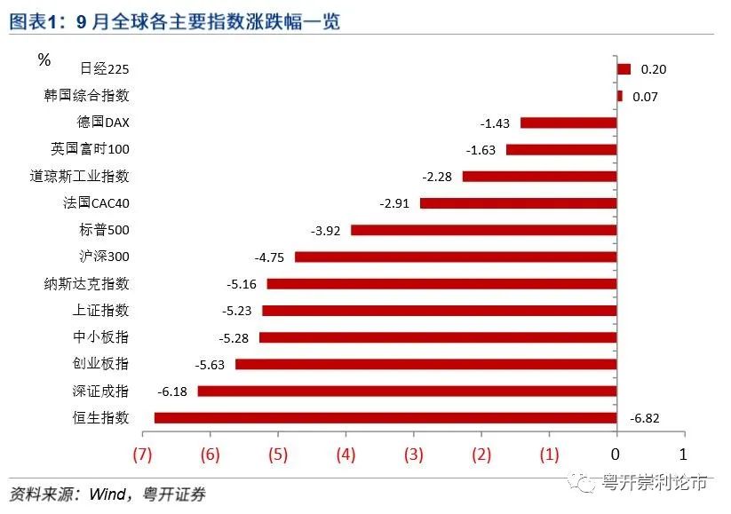 9月A股走势震荡。9月全球主要股指整体表现偏弱,截止9月30日收盘,所跟踪的指数中仅有日经225和韩国综合指数小幅收涨,欧美股市普遍下跌。受流动性、市场估值以及外围扰动等因素影响,A股走势整体偏弱,9月份沪深300、上证综指、创业板指的跌幅分别为-4.75%、-5.23%、-5.63%。