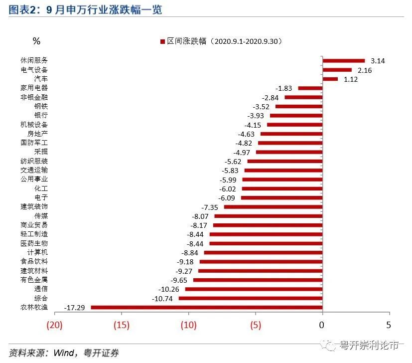 市场风格方面,9月周期类行业相对抗跌。休闲服务、电气设备、汽车行业收涨,家用电器、非银金融、钢铁、银行跌幅相对较小,前期涨幅较大的科技股和以农林牧渔、食品饮料为代表的消费板块出现较大幅度回调。
