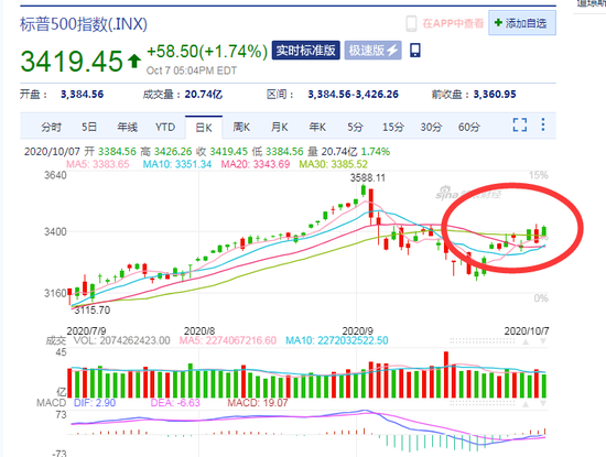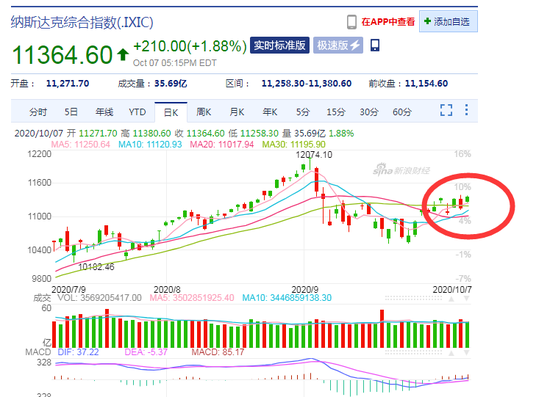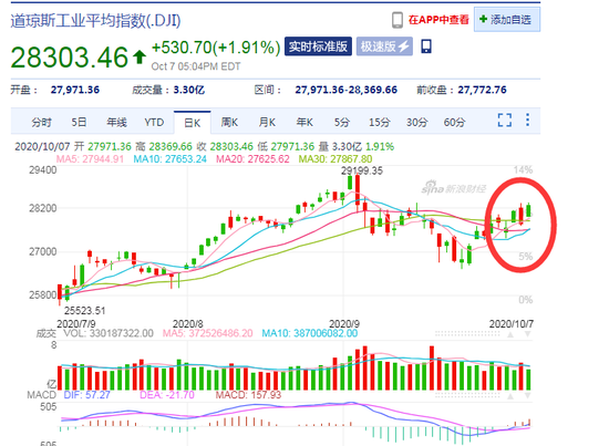 10月7日:美股三大股指全线收涨,道指涨1.91%,收复28000点;纳指涨1.88%,报11364.60;标普500指数涨1.74%,报3419.33。