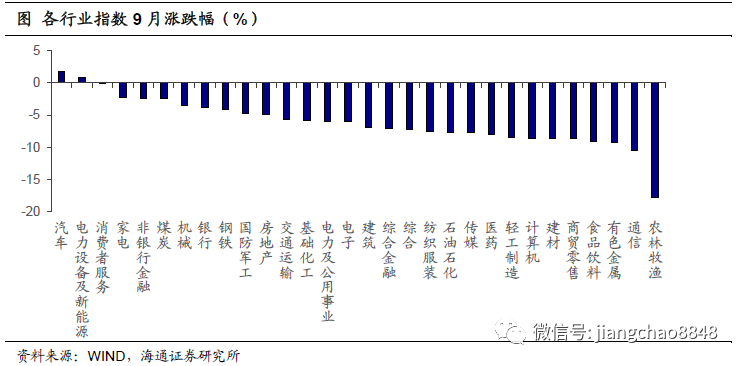 行业多数下跌,前期抱团板块调整明显。9月WIND全A指数月涨跌幅-5.97%,沪深300月涨跌幅-4.75%,创业板指月涨跌幅-5.63%,上证50月涨跌幅-3.33%。行业多数下跌,前期抱团明显的医药消费等估值相对较高的板块回调明显,汽车、电力设备及新能源等小幅上涨。