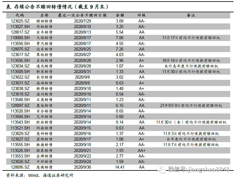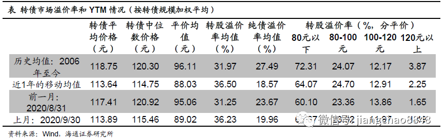 1)转债指数下跌。9月中证转债指数下跌3.51%,同期沪深300指数下跌4.75%,上证50下跌3.33%,创业板指下跌5.63%。9月特发转2、嘉友转债、赣锋转2等17只转债上市,航电转债、玲珑转债、环境转债等15只转债退市。涨幅前5位分别是起步转债(13.8%)、隆20转债(13.5%)、蓝晓转债(13.2%)、福莱转债(9.3%)、上机转债(8.9%)。2)行业整体下跌。2020年9月转债全样本指数(包含公募EB)下跌2.83%。从风格来看,高价股性券和小盘券跌幅较大。从行业来看,必需消费和医药跌幅最大,金融和电力交运回调幅度较小。3)平均转股溢价率上升。截至9月末全市场的转股溢价率均值36.23%,环比被动抬升4.98个百分点;纯债溢价率均值19.96%,环比下降3.71个百分点。平价80元以下、80-100元、100-120元、120元以上转债的转股溢价率分别为65.87%、23.92%、11.97%、1.49%,环比分别变动5.77、0.56、-1.88、-0.17个百分点。4)9只转债公告发行。9月新疆交建(8.5亿元)、崇达技术(14亿元)等9只转债公告发行。审核方面,共有侨银环保(4.2亿元)、大参林(14.05亿元)等22只转债获得批文,北陆药业(5亿元)、精研科技(5.7亿元)等21只转债过会,震安科技(2.85亿元)、利民股份(9.8亿元)等17只转债获受理。此外,9月新增了金田铜业(15亿元)、东宏股份(5亿元)等14只转债预案。
