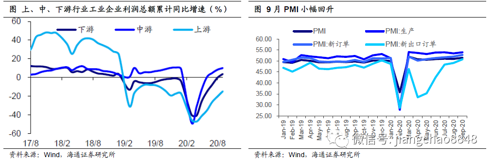 经济复苏延续。9月全国制造业PMI小幅回升至51.5%,创4月以来新高,也是18年以来同期新高。从新订单情况来看,9月新订单指数连续5个月上行,新出口订单指数年内首次回升至线上。此外工业利润增速稳定,上游利润改善显著,钢铁、化纤、有色、化工和建材利润增速降幅均有明显收窄,下游汽车、纺织增速由负转正,中游行业涨跌互现。