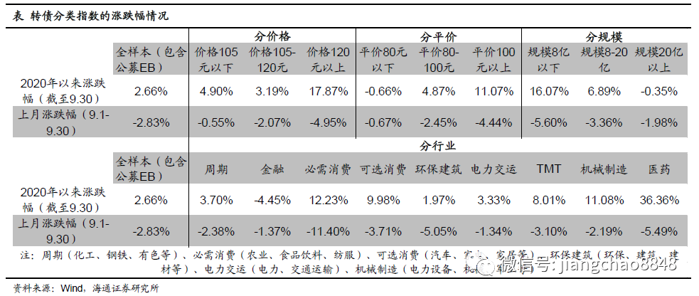 2020年9月转债全样本指数(包含公募EB)下跌2.83%,跌幅小于中证转债指数(-3.51%)。