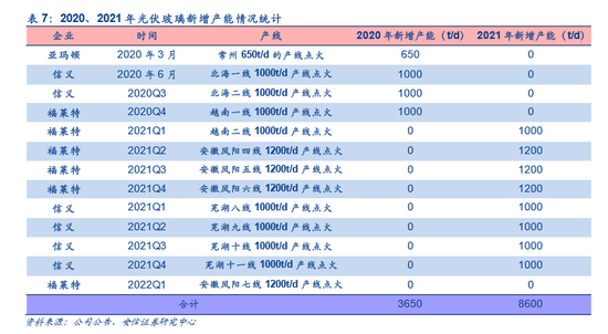 从行业目前的扩产计划看,未来新增产能依然主要集中在头部企业,在建产能包括信义光能安徽芜湖四条1000t/日线、福莱特越南海防两条1000t/日线和安徽凤阳四条 1200t/日线,规划产能包括南玻4条1200t/日线。龙头产能保持快速扩张,行业地位稳固,目前在建产能投产后双寡头市占率有望进一步提升70%以上。