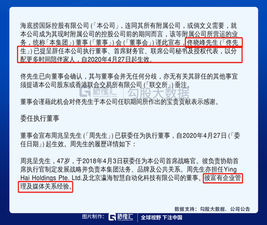 海底捞是2018年9月上市的,2019年5月4日,海底捞联席公司的秘书及董事会秘书调离工作岗位,由原本担任公司财务总监的佟晓峰先生担任公司的联席公司秘书和董事会秘书。