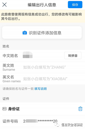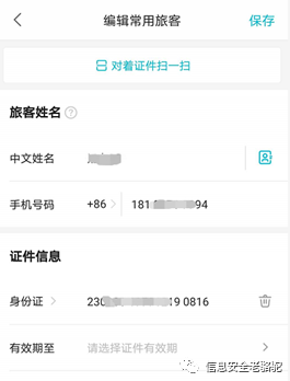 《凭SIM卡登陆各软件!上海警方披露最新型盗刷手法》,大家有兴趣可以搜一下,看新闻介绍的犯罪手法,基本上和我遇到的这个案件是一致的,只是获取身份信息的途径不一样,我上篇文章中也提到,犯罪分子精心设计的这么一套犯罪脚本,在身份信息获取这种比较容易的环节上,一定是会有备用方案的,目前据我所知的在获得短信权限的情况下比较容易获取的如各类连锁酒店APP(如华住、锦江)、商旅订票类(如去哪儿),这些包含身份证信息的APP和网站,对于身份证号码信息的泄露风险并不是说不知道,只是在业务的“用户体验”面前,安全已经不算个问题了,毕竟我这种案件的数量还是不多。以去哪儿为例,在常用旅客列表中,对身份证信息进行了屏蔽显示,但点击进入信息编辑界面时就明文展示了: