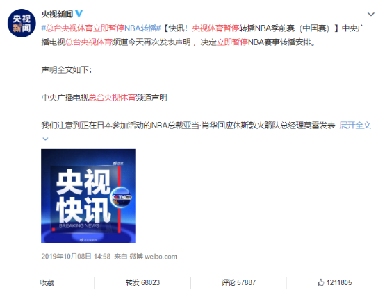 今日上午,因莫雷事件停播一年后,央视选择复播NBA。
