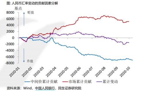 从人民币汇率变动的贡献因素分解来看,民生证券分析表示,今年4-5月,市场贡献贬值,中间价贡献升值,人民币汇率总体平稳。6-7月,市场贡献平稳,中间价贡献升值,人民币汇率不断升值。8月初至9月中,市场贡献升值,中间价贡献平稳,人民币汇率继续升值。9月21日至25日当周,汇率短暂休整,中间价贡献先贬后升。9月底以来,中间价贡献升值。
