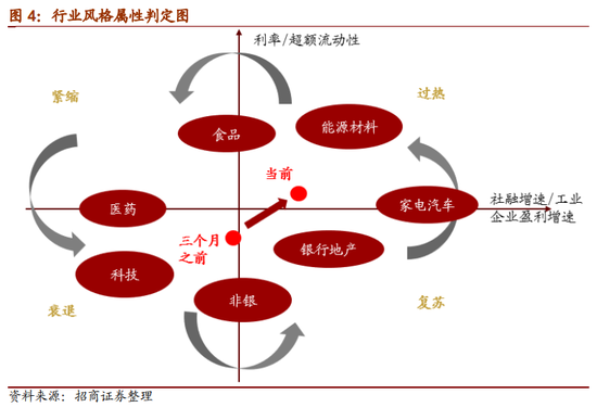 从当前的流动性及企业盈利的状况来看,超额流动性转为负增长,宏观货币政策由宽松转向中性,边际收紧。社融数据超预期回升,企业盈利增速改善,这表明经济正处于复苏期,类似于2005/2006/2012/2016年。根据风格属性判断图,当经济由衰退转向复苏时,金融地产、可选消费将有好的表现。