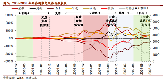 (3)流动性紧缩使得企业投资意愿下降,导致社融与工业企业盈利增速的下滑,经济处于紧缩阶段。食品、医药等防御类资产会有好的表现,市场风格偏大盘消费,典型的如2007年、2011年、2013年、2017年。